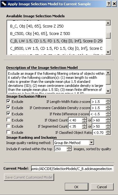 Open the image selection model dialog by clicking the “Apply Image Filters” button. Please consult the image selection model page for descriptions of each filter presented in this dialog. Once the parameters of an image selection model have been specified, the current selections can be saved by clicking “Save Selection Model”. To apply the newly created model to the current sample click “OK”.