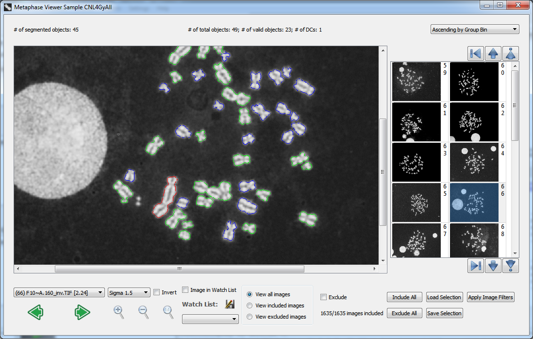 Thumbnails of metaphase images are displayed on the right side of the Metaphase Image Viewer window. Thumbnails are ordered according to the current selection within the sorting dropdown box found in the upper-right corner of the window. In this way, the order of thumbnail images mirrors the image selection dropdown in the bottom-left of the Metaphase Image Viewer window. A number appears to the right of each thumbnail which corresponds to the image number found in the image selection dropdown.